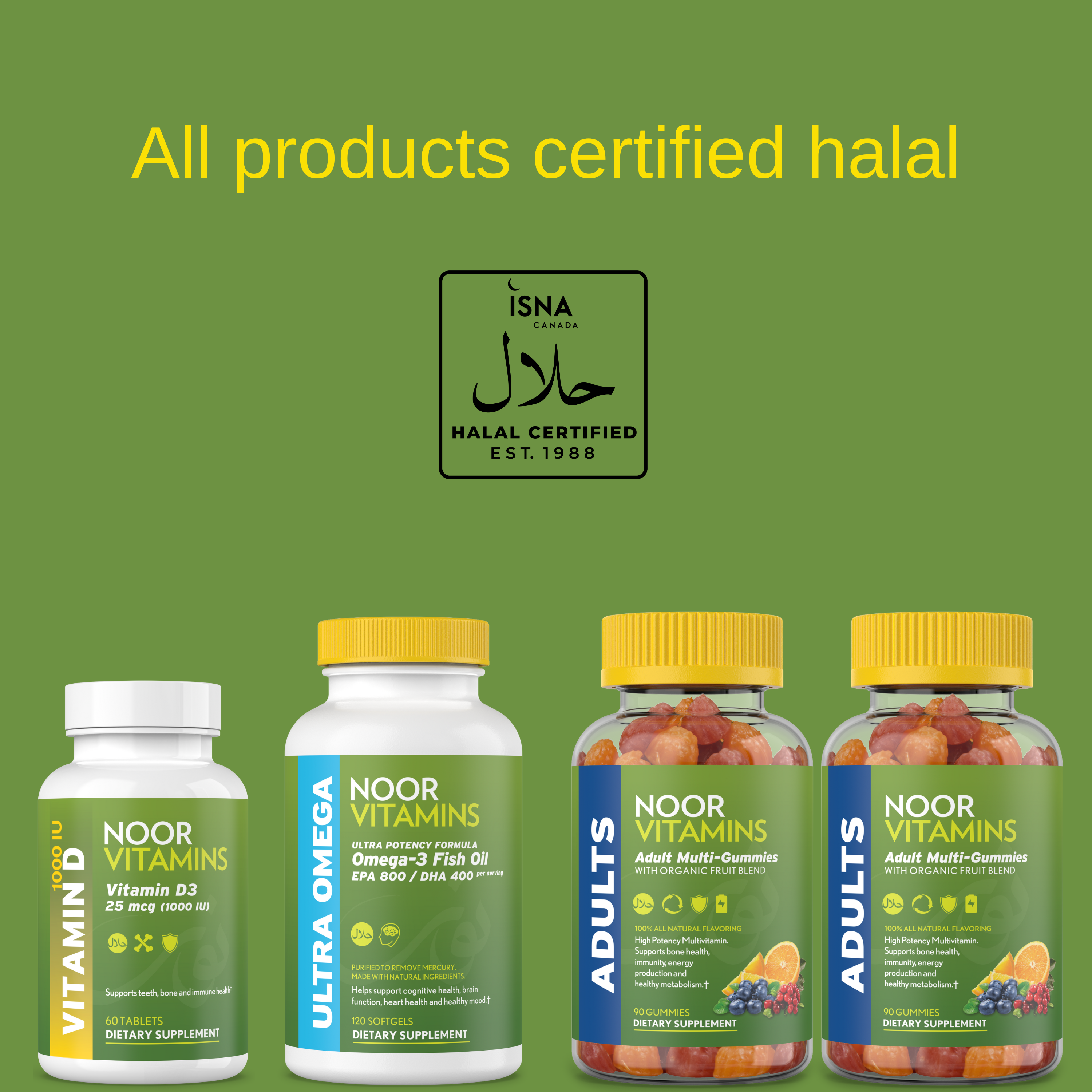 Noor Vitamins Two Month Supply Halal Adult Bundle consists of 2 of our Adult Multivitamin Gummies, 1 Omega 3 Fish Oil, and 1 Vitamin D3 1000 IU. Four bottles, for a two-month supply of your daily vitamins! Certified halal by ISNA!