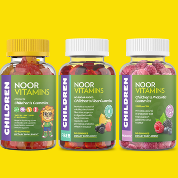 Introducing Noor Vitamins Children Fiber Gummy. Sugar free Fiber Gummies for kids are packed with 2 grams of plant based soluble fiber per gummy. Noor Vitamins soluble fiber gummies for children helps supports digestion, and ease constipation. This fiber is also prebiotic, meaning it supports your gut microflora to further aid in digestion. Certified halal by ISNA. Naturally sourced colors, flavors, preservatives and sweeteners. Vegan, Non-GMO, and made without gelatin, peanuts, gluten, sesame seeds, wheat, yeast, eggs, milk, soy, mustard seeds, seafood, sulphites. Each bottle contains 90 gummies, a 45 or 90 day supply, depending on child's age (age 2-3: 1 gummy per day, ages 4+: 2 gummies per day). These fiber gummies taste delicious - a mix of strawberry, blackberry and peach flavors.
